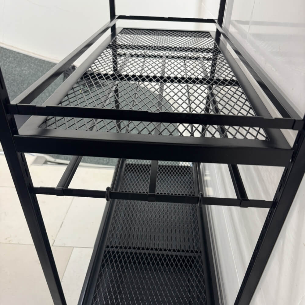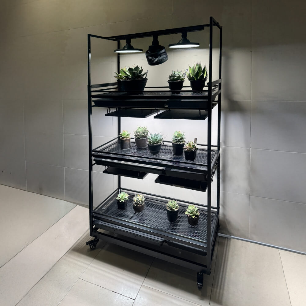 棚板の位置は簡単に調整でき、植物の成長やサイズに合わせて自由にレイアウト変更が可能。観葉植物や多肉植物、小鉢から中型鉢まで幅広く対応し、空間演出の自由度を高めます。